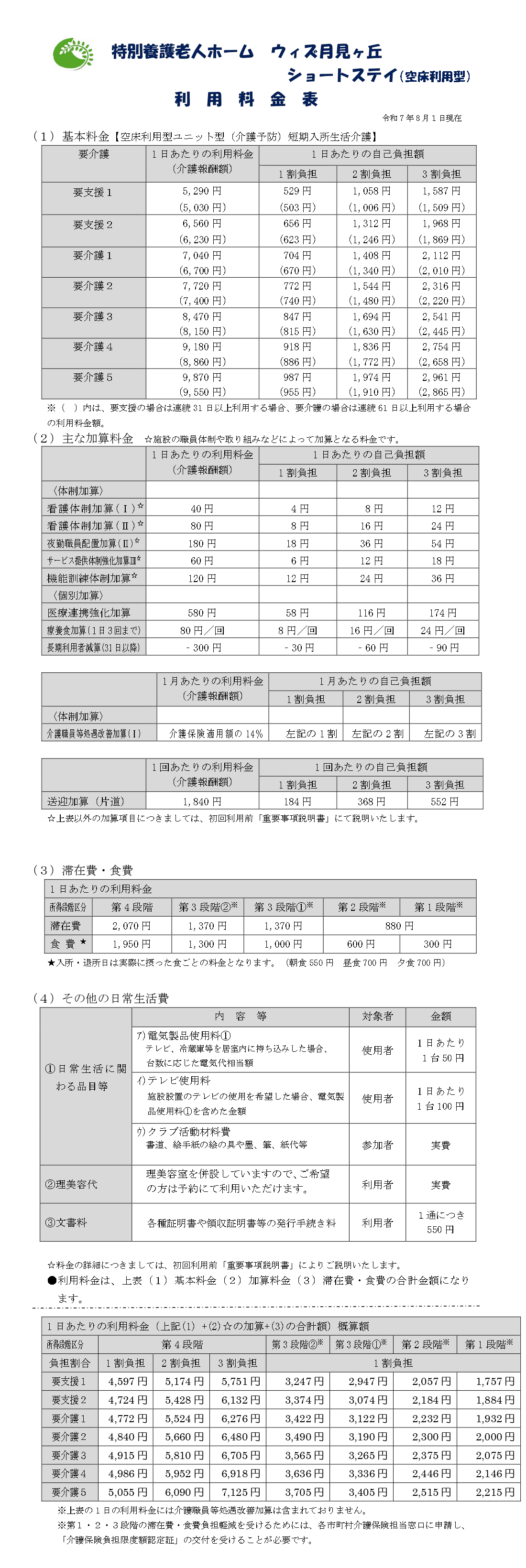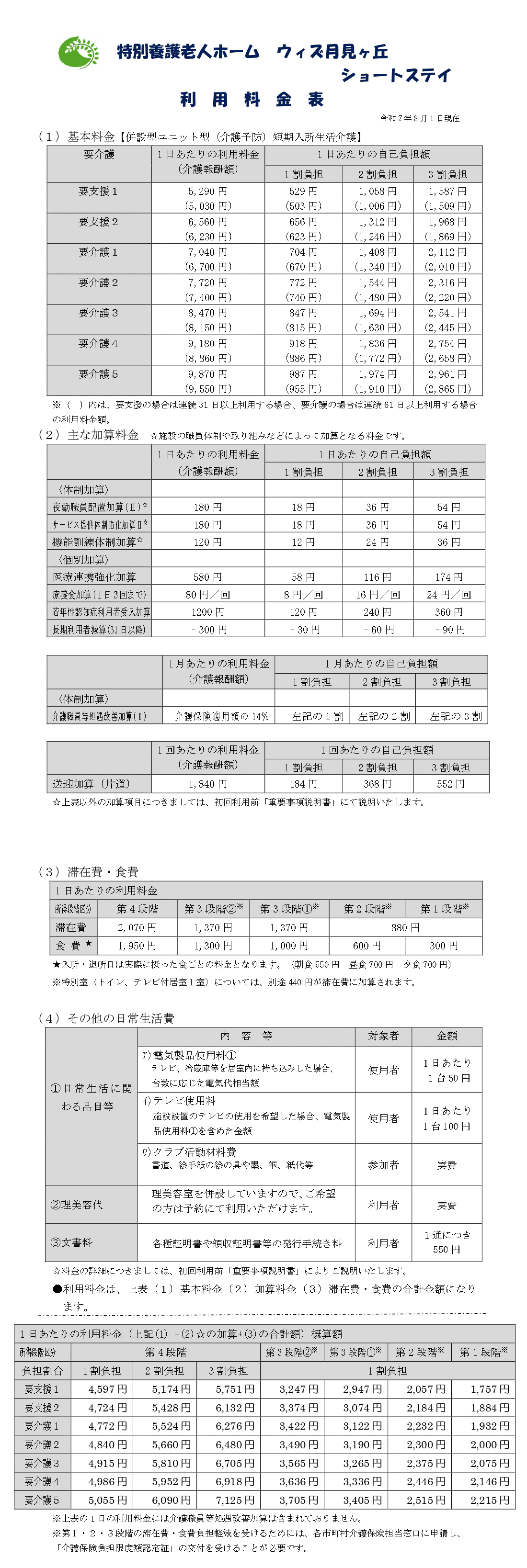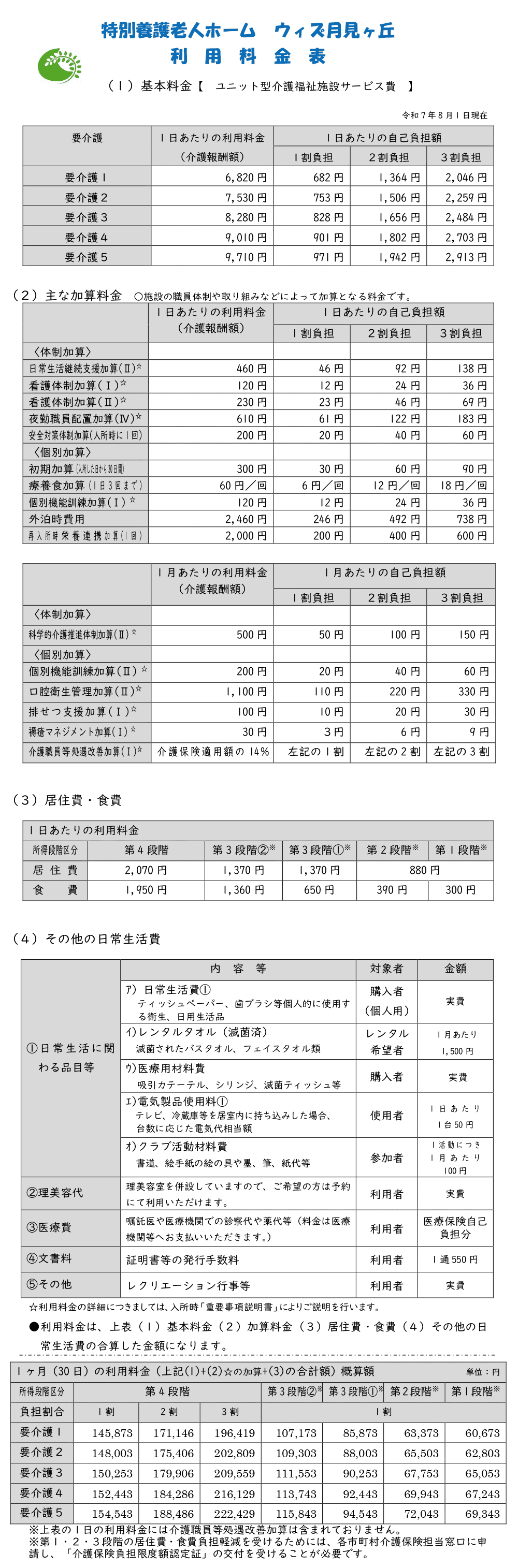 地域密着型小規模特別養護老人ホーム ウィズ 月見ヶ丘 利用料金表
